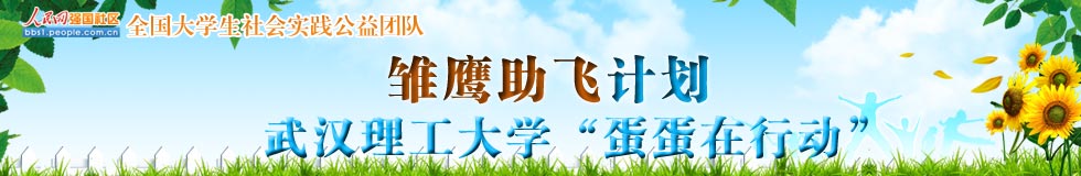 武漢理工大學“蛋蛋在行動”成立于2011年12月,是一支致力于開展包括支教在內(nèi)的公益活動,援助山區(qū)貧困學生的公益團隊,目前擁有成員89人。2年多來,舉辦的活動有暑期支教、蛋蛋公益文化周、暖冬行動、聯(lián)合余區(qū)六院青協(xié)為胡夢婷募捐、愛心義賣等活動,吸引廣大師生參與,累計覆蓋人數(shù)超過一千人,募集款項18738.42元、物品五千余件。