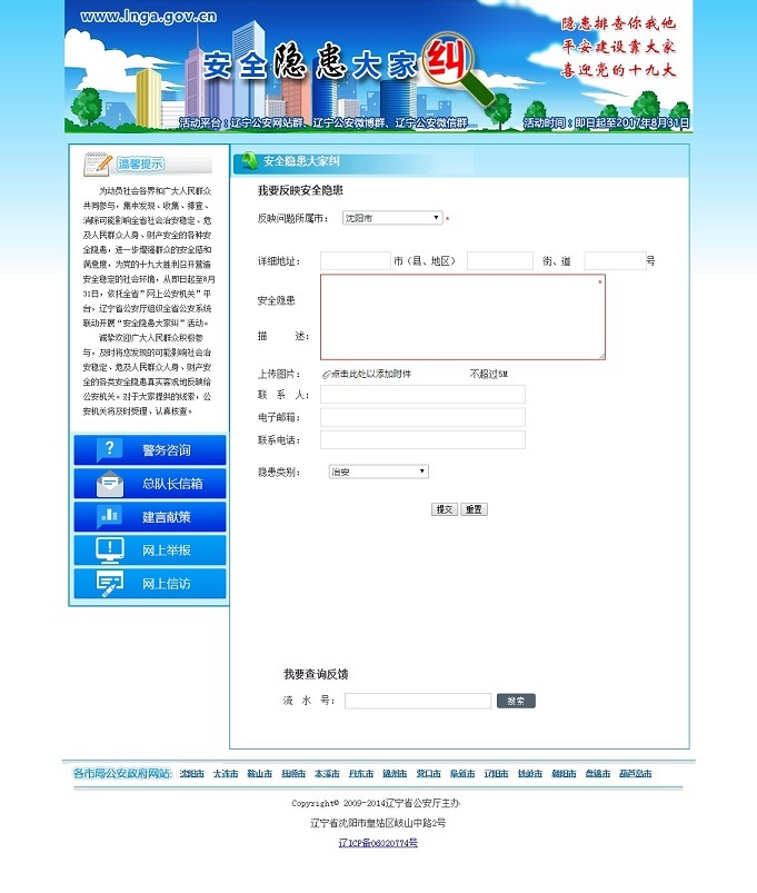 為深入貫徹落實(shí)習(xí)近平總書(shū)記系列重要講話精神,充分發(fā)揮全省“網(wǎng)上公安機(jī)關(guān)”平臺(tái)作用,遼寧省公安廳從即日起至8月31日,組織全省公安機(jī)關(guān)依托各級(jí)公安政務(wù)網(wǎng)站、公安政務(wù)微博、公安政務(wù)微信平臺(tái),集中開(kāi)展“安全隱患大家糾”活動(dòng),全面開(kāi)啟遼寧公安“查患治患”工作的“互聯(lián)網(wǎng)+”模式。