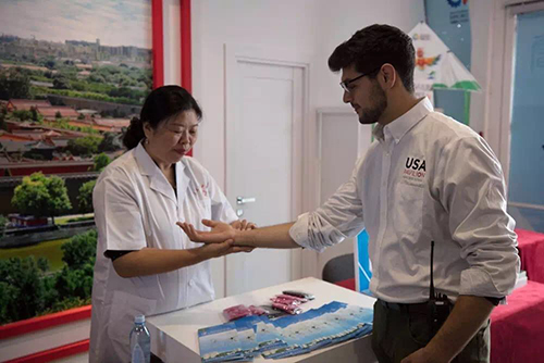 當(dāng)薩仁在中國館尾廳進(jìn)行綠色中醫(yī)針灸展示時(shí),不時(shí)有好奇的游客上來體驗(yàn)。一位在中國館交流的美國館志愿者也想親身體驗(yàn)中醫(yī)針灸。短暫的號(hào)脈后,薩仁說:“這小伙子體格很好,就是手腳會(huì)在冬天發(fā)涼!闭f著便幫美國館志愿者進(jìn)行舒解經(jīng)絡(luò)的治療。
