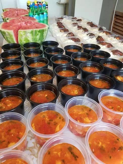 做好飯,就要忙著分盒飯,兩位大廚真是一點休息的時間都沒有。為了方便領取,兩位大廚從市場采購到專用飯盒,每次都精心包裝,水果、主食、菜品整齊有序擺放,像完成一件微雕工藝品那樣專注投入。