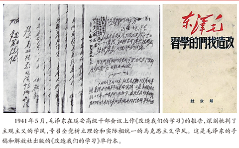 延安整風(fēng)運(yùn)動以反對主觀主義、宗派主義、黨八股,樹立馬克思主義作風(fēng)為主要內(nèi)容。而鑒于深重的思想之弊和慘痛的實(shí)踐教訓(xùn),反對主觀主義以整頓學(xué)風(fēng),成為開展整風(fēng)運(yùn)動的關(guān)鍵。整風(fēng)運(yùn)動開展后,毛澤東就緊緊抓住思想方法和作風(fēng)問題不放。他在給中央研究組同志的信中指出:學(xué)習(xí)理論要“以研究思想方法論為主”。破除錯誤的思想方法,暢行正確的思想作風(fēng),最重要的就是要遵循實(shí)事求是的思想路線,做到理論聯(lián)系實(shí)際。“實(shí)事求是”這個(gè)詞,并非毛澤東首創(chuàng),但把“實(shí)事求是”上升到黨的思想路線的高度,則是毛澤東的功勞。毛澤東強(qiáng)調(diào),“要分清創(chuàng)造性的馬克思主義和教條式的馬克思主義”,“宣傳創(chuàng)造性的馬克思主義”,“使中國革命豐富的實(shí)際馬克思主義化”。不能從理論上來思考中國革命實(shí)踐的人,是不能妄稱為馬克思主義理論家的。只有從客觀實(shí)際中概括出而又在客觀實(shí)際中得到證明的理論,才稱得起我們所講的理論。