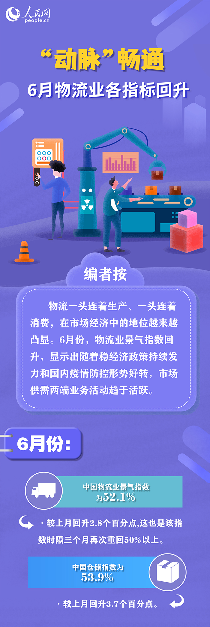 物流被稱作是國民經(jīng)濟(jì)的“晴雨表”。中國物流與采購聯(lián)合會會長助理、高級經(jīng)濟(jì)師何輝在接受人民網(wǎng)“強(qiáng)觀察”欄目記者采訪時表示,從物流業(yè)景氣指數(shù)等數(shù)據(jù)看,隨著國內(nèi)疫情防控形勢好轉(zhuǎn)和穩(wěn)經(jīng)濟(jì)系列政策持續(xù)發(fā)力,6月份國內(nèi)市場供應(yīng)鏈上下游業(yè)務(wù)活動進(jìn)一步恢復(fù),并逐步趨于活躍。