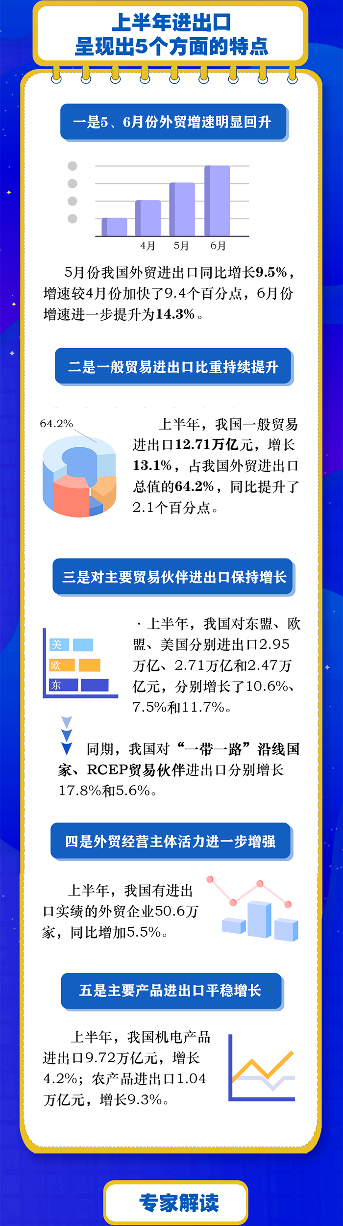 上半年我國外貿(mào)進出口展現(xiàn)出較強的韌性,一季度平穩(wěn)開局,5、6月份迅速扭轉(zhuǎn)了4月份增速下滑的趨勢,為全年外貿(mào)保穩(wěn)提質(zhì)打下了堅實的基礎(chǔ)。據(jù)海關(guān)統(tǒng)計,今年上半年我國貨物貿(mào)易進出口總值19.8萬億元人民幣,同比增長9.4%。其中,出口11.14萬億元,增長13.2%;進口8.66萬億元,增長4.8%。