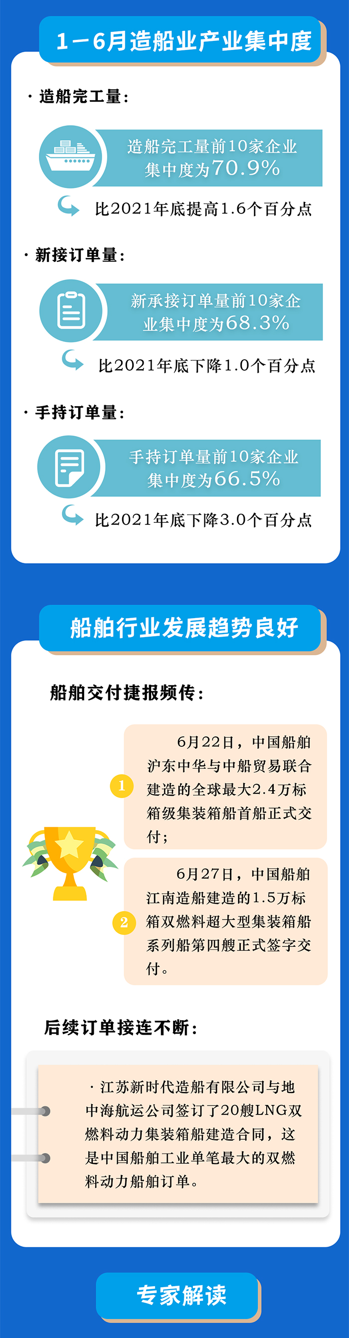“上半年中國船舶工業(yè)克服不利影響,主要指標(biāo)繼續(xù)保持世界第一,這是一個(gè)了不起的成績!敝袊肮I(yè)行業(yè)協(xié)會(huì)秘書長李彥慶在接受人民網(wǎng)“強(qiáng)觀察”欄目記者采訪時(shí)表示,上半年我國船舶工業(yè)呈現(xiàn)出五方面特點(diǎn):一是接單的船型結(jié)構(gòu)不斷優(yōu)化。從以散貨船和油船等傳統(tǒng)船型為主,到現(xiàn)在散貨船、油船、集裝箱船、氣體船、客船以及特種船舶均衡發(fā)展。二是重點(diǎn)船型加速突破,新型裝備不斷涌現(xiàn)。今年上半年,大型LNG運(yùn)輸船成交30艘,創(chuàng)造歷史新記錄;汽車運(yùn)輸船市場(chǎng)份額穩(wěn)居世界第一;海上風(fēng)電安裝船、深遠(yuǎn)海養(yǎng)殖裝備等新型海洋裝備實(shí)現(xiàn)批量接單。三是手持訂單不斷增長,為加快轉(zhuǎn)型升級(jí)奠定堅(jiān)實(shí)基礎(chǔ)。當(dāng)前,國內(nèi)大部分企業(yè)訂單已能滿足2~3年生產(chǎn)量,基本解決了持續(xù)生產(chǎn)經(jīng)營的問題。四是產(chǎn)業(yè)結(jié)構(gòu)日趨合理,“專精特新”發(fā)展理念逐步深入。五是跨行業(yè)融合發(fā)展的“產(chǎn)業(yè)生態(tài)體系”逐步建立。