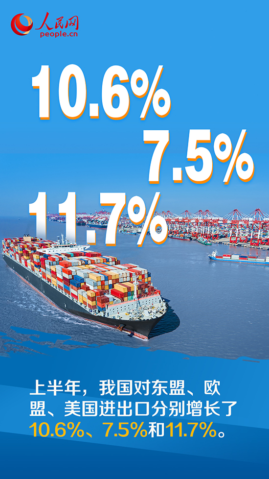 上半年,我國(guó)對(duì)東盟、歐盟、美國(guó)進(jìn)出口分別增長(zhǎng)了10.6%、7.5%和11.7%。同期,我國(guó)對(duì)“一帶一路”沿線國(guó)家、區(qū)域全面經(jīng)濟(jì)伙伴關(guān)系協(xié)定(RCEP)貿(mào)易伙伴進(jìn)出口分別增長(zhǎng)17.8%和5.6%。